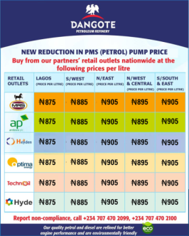 As a result of this reduction, Nigerians will now purchase the product at the following prices: N875 per litre in Lagos; N885 per litre in the South West; N895 per litre in the North West and North Central, while it will be sold for N905 per litre in the South East, South South, and North East.