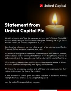 Capital Plc announce the passing of six of our dear colleagues, following the tragic fire at Afriland Towers, on Tuesday, September 16, 2025.